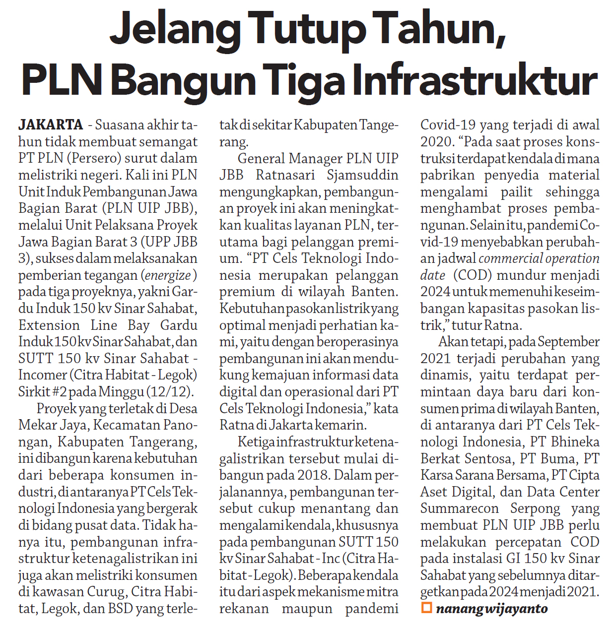 General Manager PLN UIP JBB Ratnasari Sjamsuddin mengungkapkan, pembangunan proyek ini akan meningkatkan kualitas layanan PLN, terutama bagi pelanggan premium. “PT Cels Teknologi Indonesia merupakan pelanggan premium di wilayah Banten. Kebutuhanpasokanlistrikyang optimal menjadi perhatian kami, yaitu dengan beroperasinya pembangunan ini akan mendukung kemajuan informasi data digital dan operasional dari PT Cels Teknologi Indonesia,” kata Ratna di Jakarta kemarin.