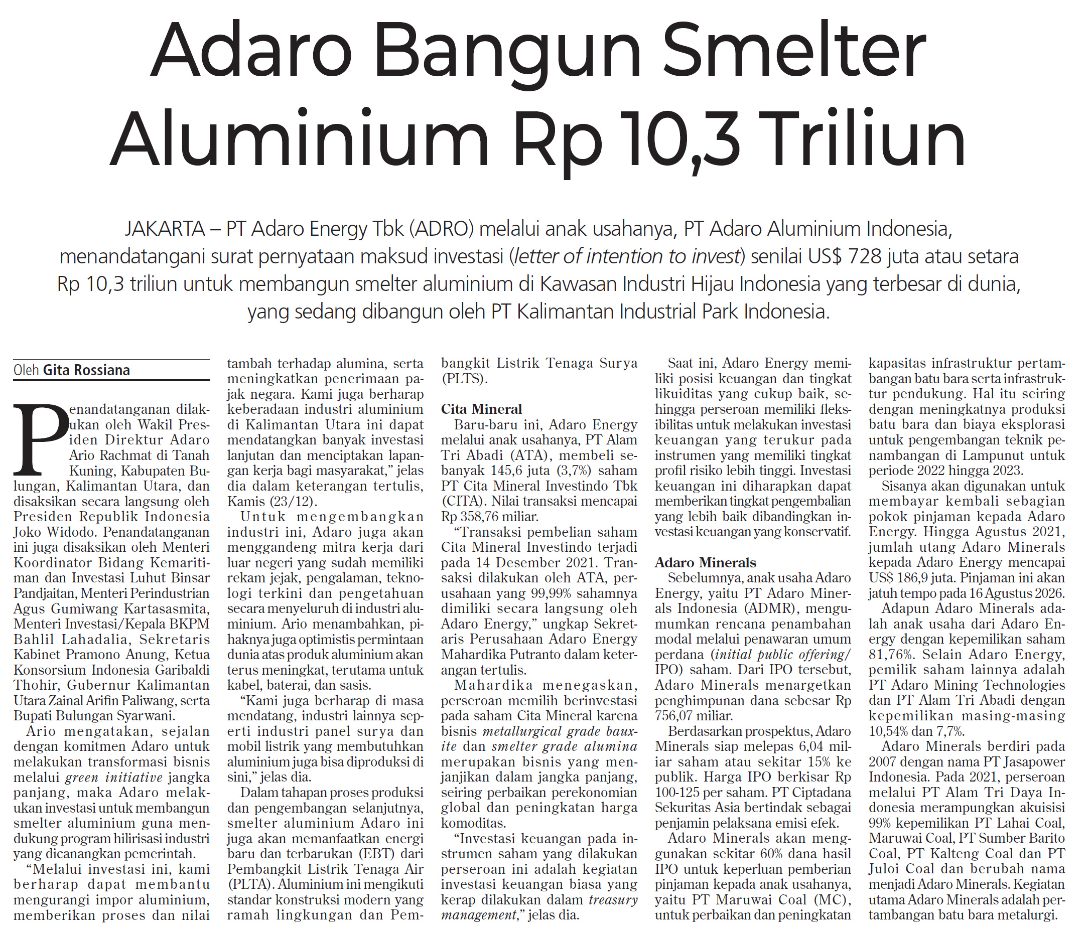JAKARTA - PT Adaro Energy Tbk (ADRO) melalui anak usahanya, PT Adaro Aluminium Indonesia, menandatangani surat pernyataan maksud investasi {letter of intention to invest) senilai US$ 728 juta atau setara Rp 10,3 triliun untuk membangun smelter aluminium di Kawasan Industri Hijau Indonesia yang terbesar di dunia, yang sedang dibangun oleh PT Kalimantan Industrial Park Indonesia.
